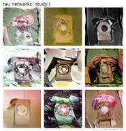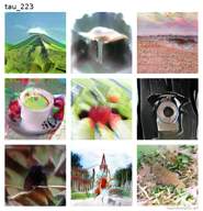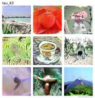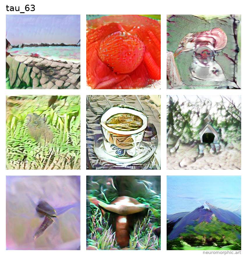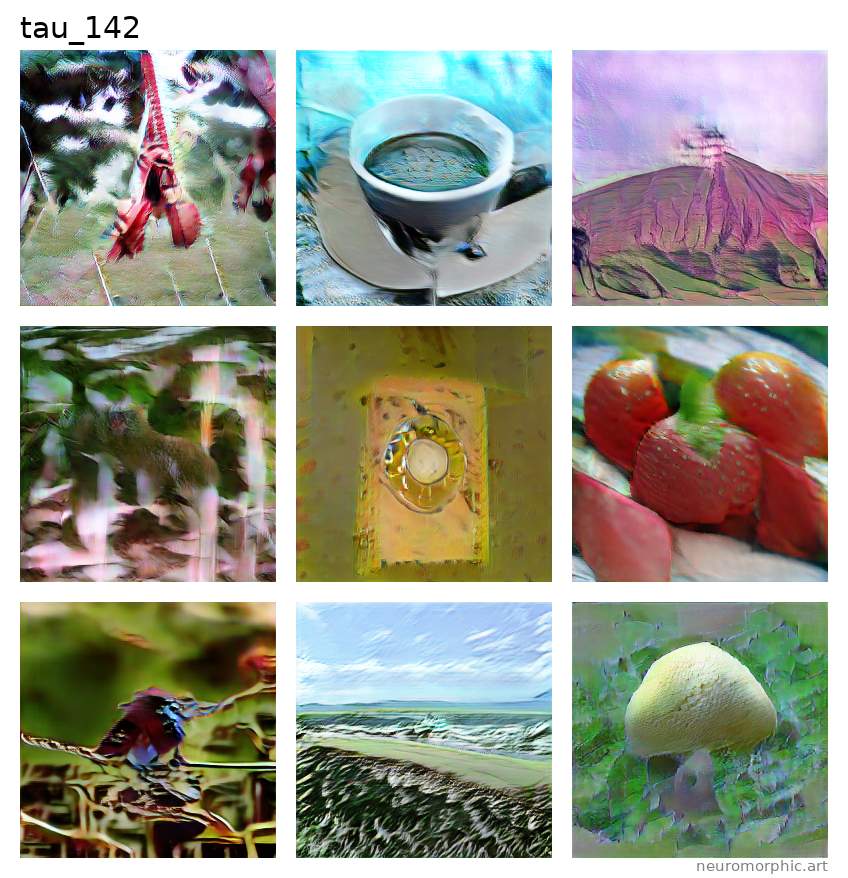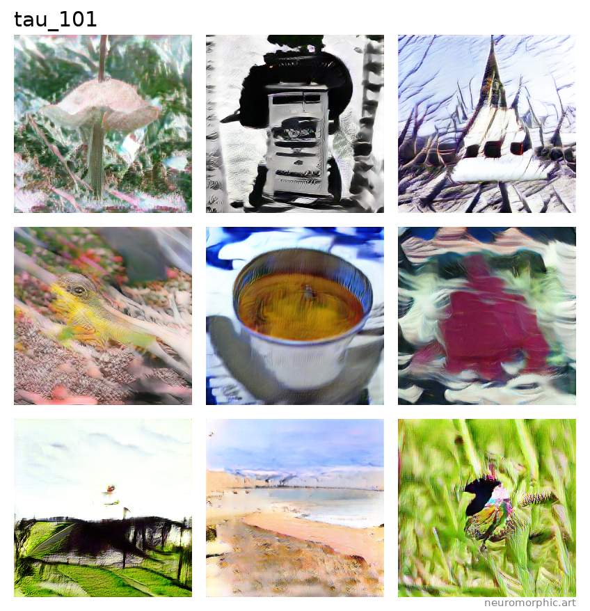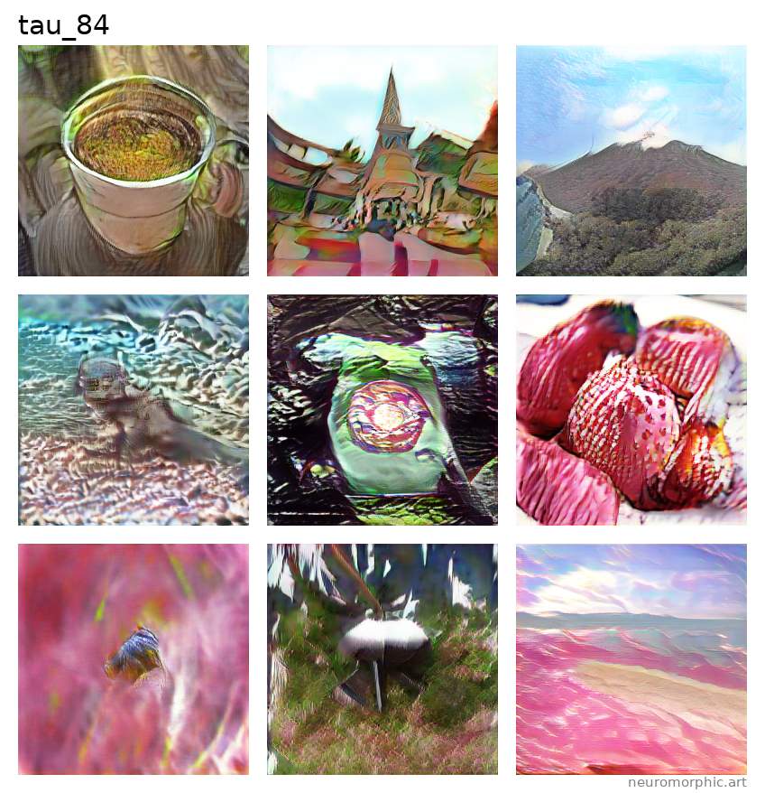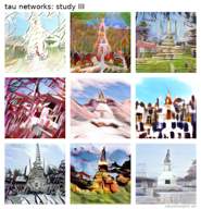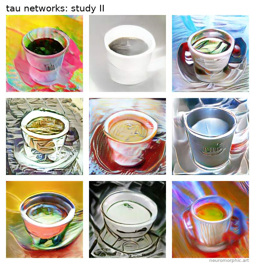 Each plate shown below was created by one of the neural networks belonging to the tau family. The particular neuromorphic artist network is singled out by the identifier shown at the top of the plate — the neural network's “name”.