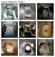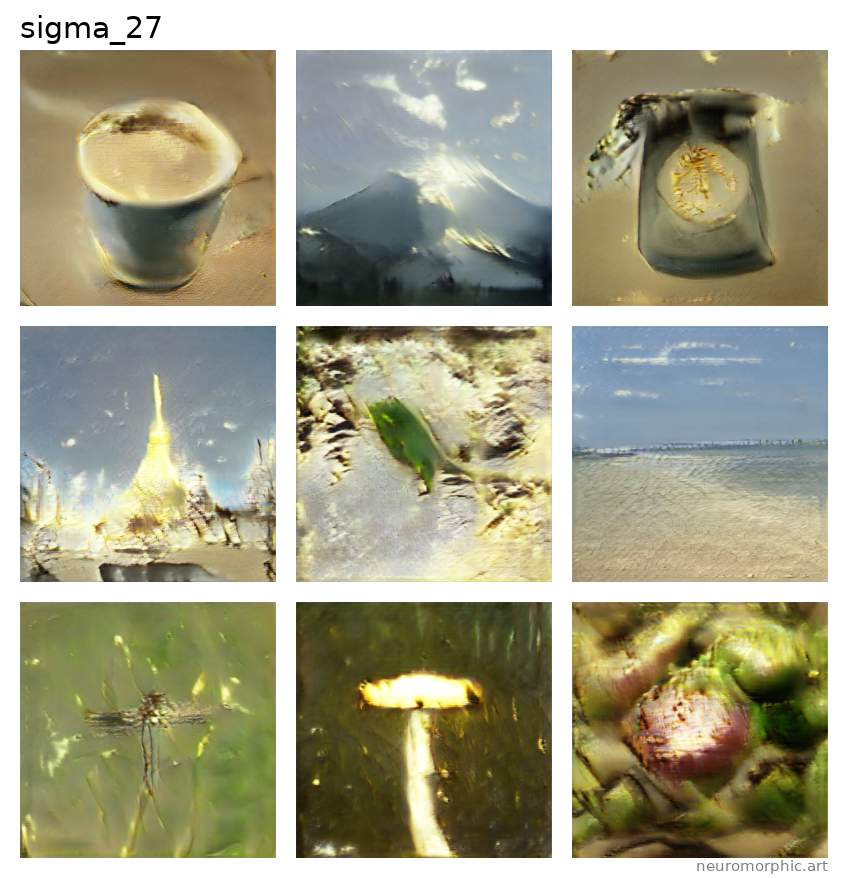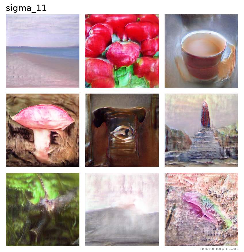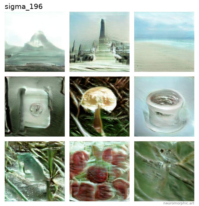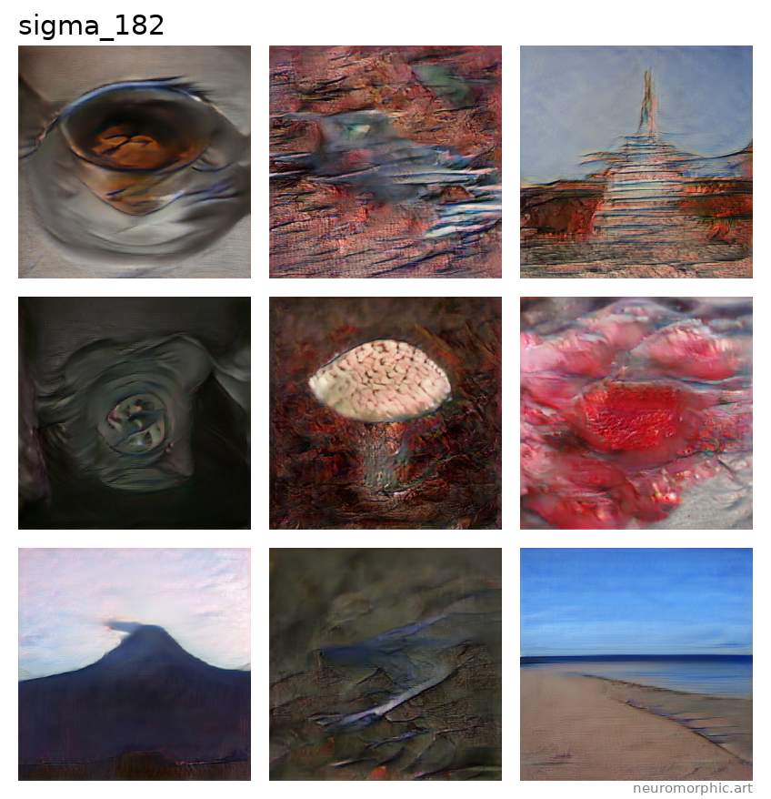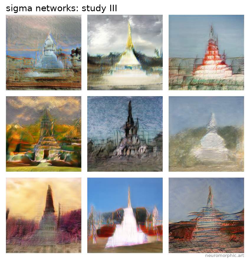 Each plate shown below was created by one of the neural networks belonging to the sigma family. The particular neuromorphic artist network is singled out by the identifier shown at the top of the plate — the neural network's “name”.